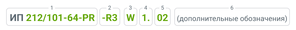 Например, извещатель пожарный комбинированный с зажимными контактами для монтажа на несущие конструкции, с 3 контактами и влагозащищенным исполнением будет иметь обозначение: ИП 212/101-64-PR-R3 W1.03 (влагозащищенный).