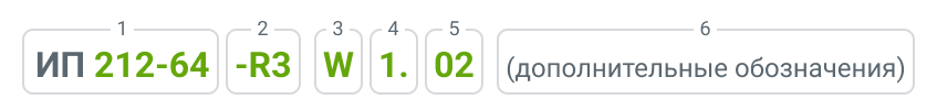 Например, извещатель пожарный дымовой с зажимными контактами для монтажа на несущие конструкции, с 3 контактами и влагозащищенным исполнением будет иметь обозначение: ИП 212-64-R3 W1.03 (влагозащищенный).