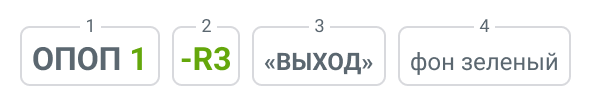 Например, оповещатель, с надписью ВЫХОД и зеленым цветом фона подложки будет иметь обозначение: ОПОП 1-R3 "ВЫХОД" фон зеленый.