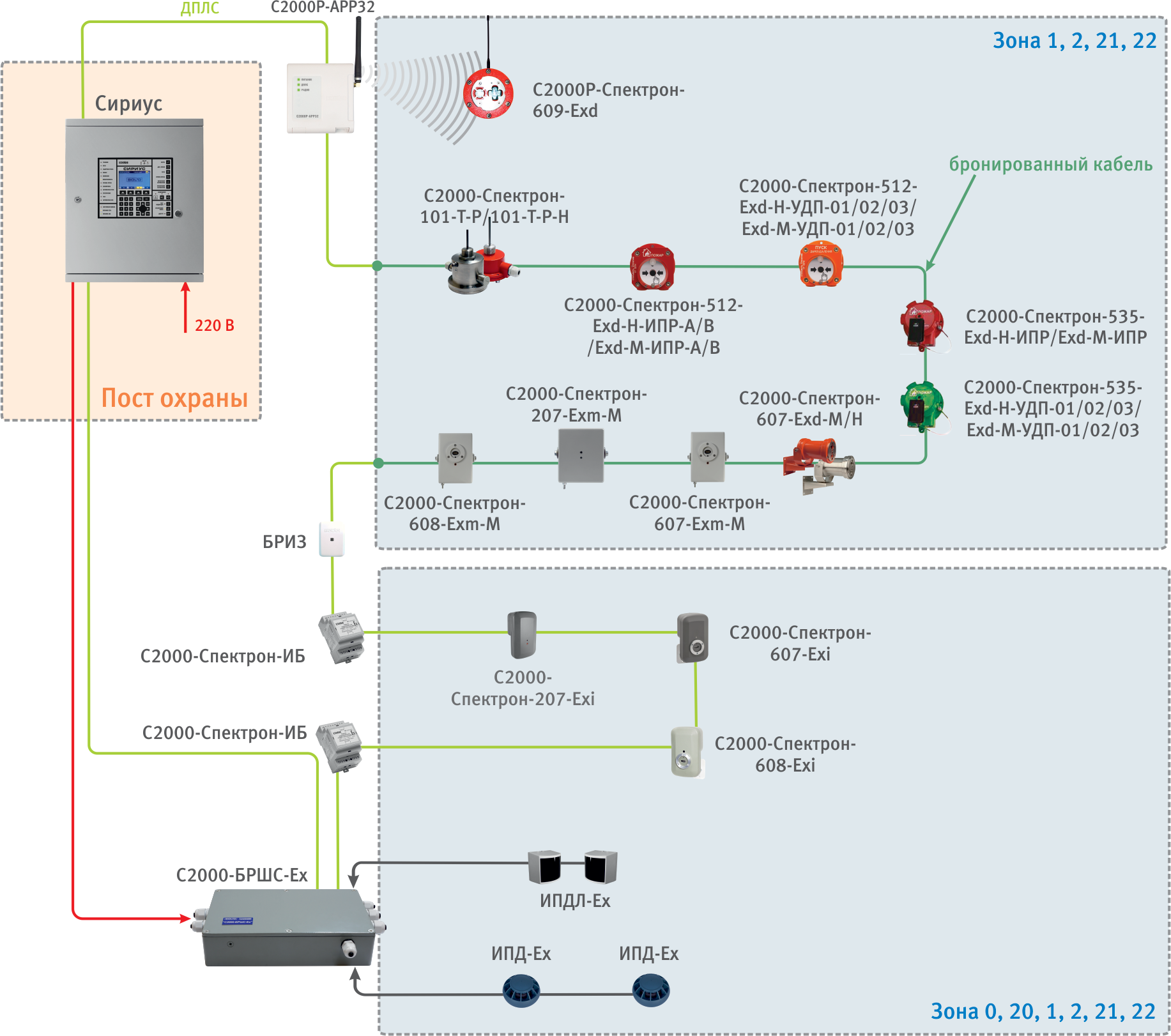 В случае необходимости оборудования автоматической пожарной сигнализацией объекта, имеющего взрывоопасные зоны, совместно с адресно-аналоговой системой, построенной на основе контроллера «С2000-КДЛ» возможно использовать искробезопасные барьеры «БРШС-Еx».